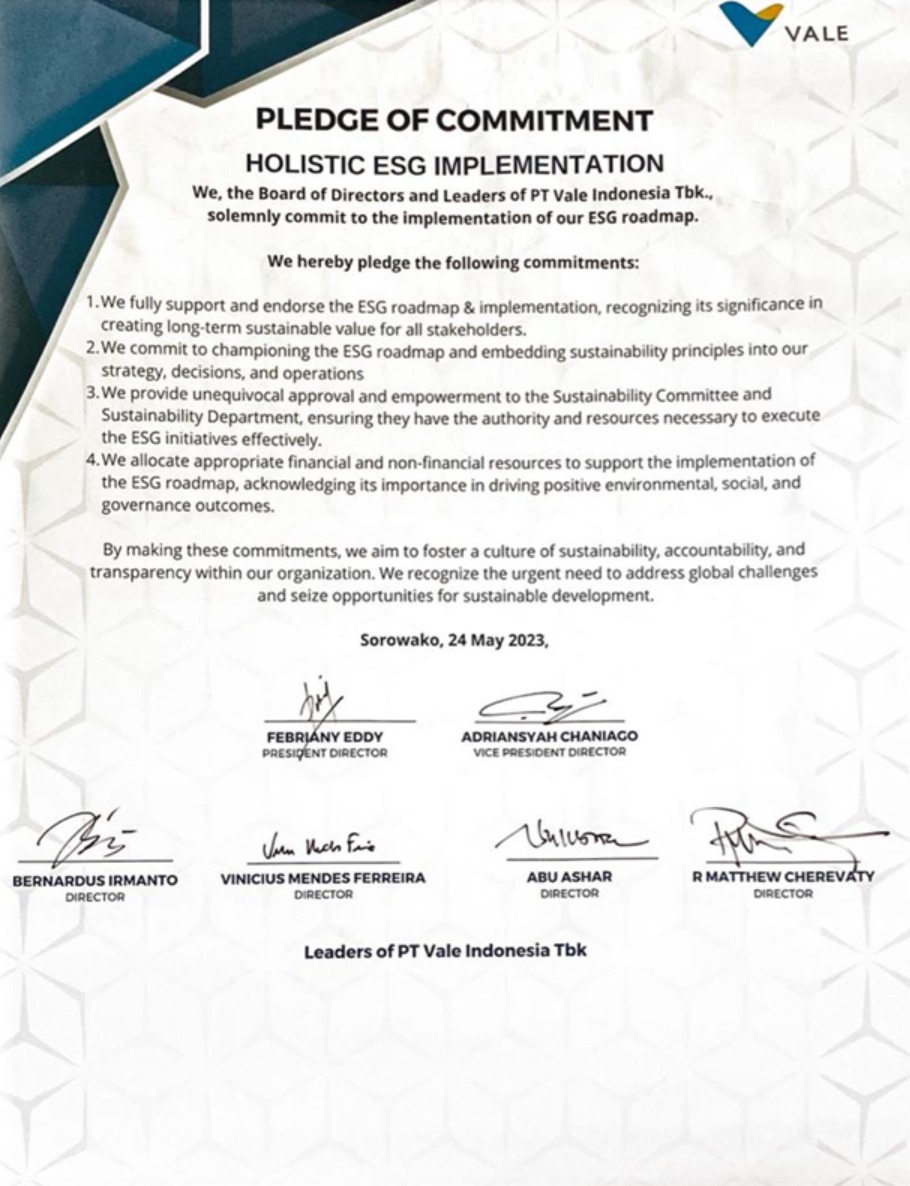 PT Vale Indonesia is dedicated to embracing exemplary ESG governance practices, not only on a national level but also on an international scale.
