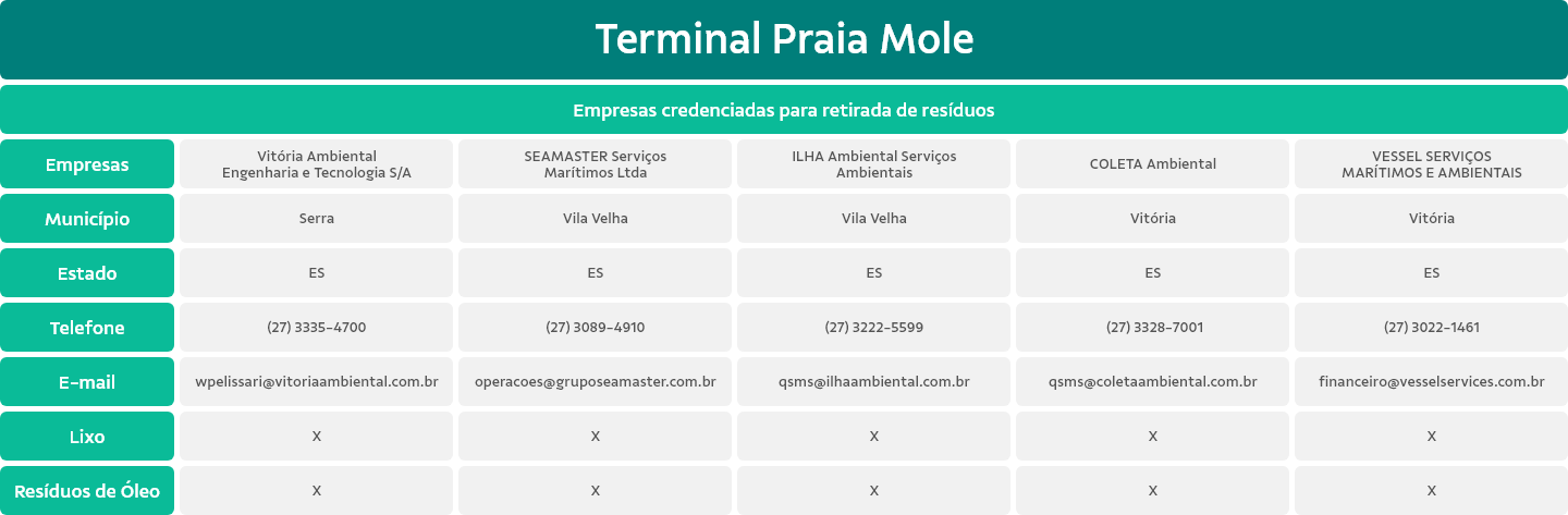 Integrados às malhas ferroviárias, nossos portos estão no Brasil, na Indonésia, na Malásia e em Omã e, assim como nossos trens, oferecem o serviço de carga para transporte de terceiros.