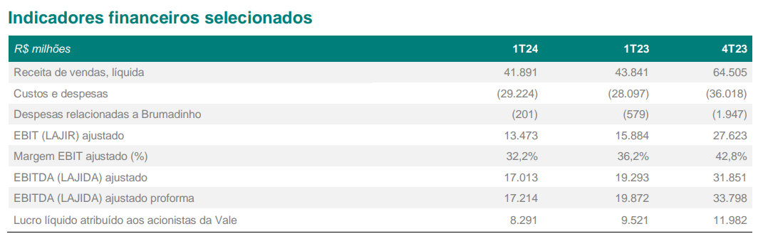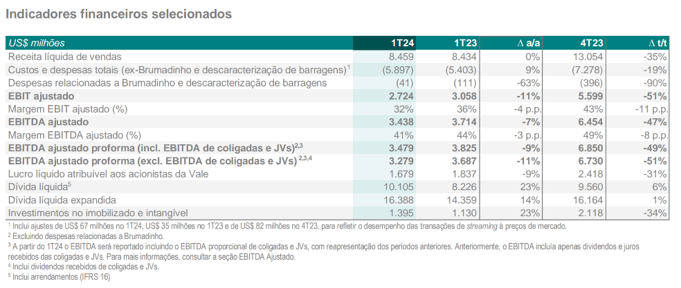 • Dívida líquida expandida de US$ 16,4 bilhões em 31 de março de 2024, US$ 0,2 bilhão maior t/t, impulsionada principalmente pelo aumento da dívida líquida. A meta de dívida líquida expandida da Vale permanece em US$ 10-20 bilhões.