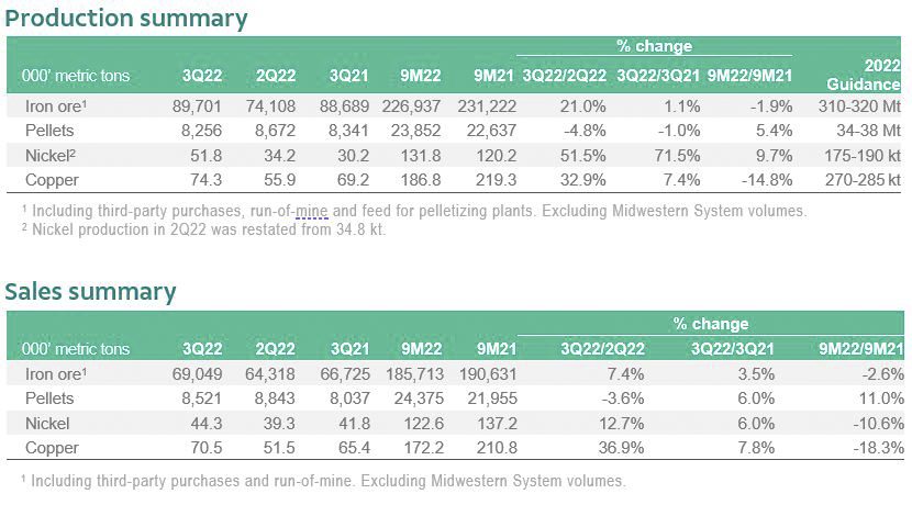 Nickel production increased 51% q/q to 51.8 kt, as refineries came back from a maintenance period in 2Q22 and the conclusion of the furnace 4 rebuild at PTVI. Nickel sales increased 13% q/q, but lagged production due to sales commitments in 4Q22 during scheduled maintenance, low availability of containerships impacting Onça Puma and shipping congestion in the UK in 3Q22.