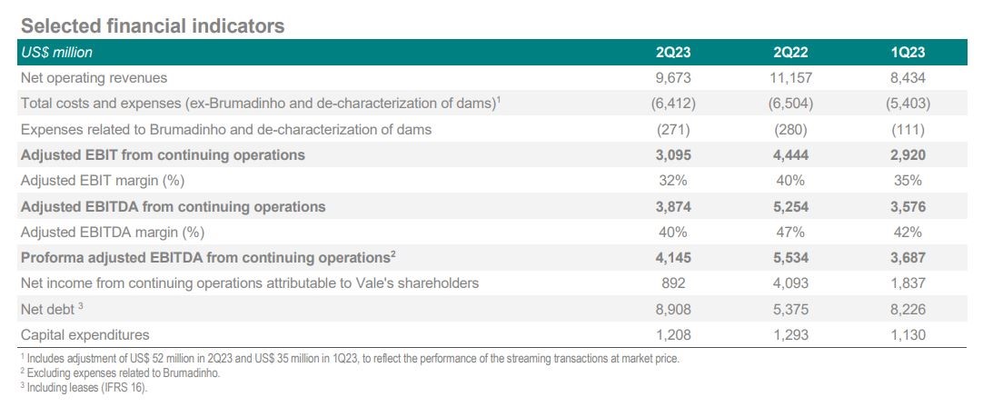 • Gross debt and leases of US$ 13.9 billion as of June 30, 2023, US$ 1.0 billion higher q/q, resulting from a US$ 1.5 billion bond issuance and US$ 0.5 million tender offer in the quarter, as part of Vale’s liability management.